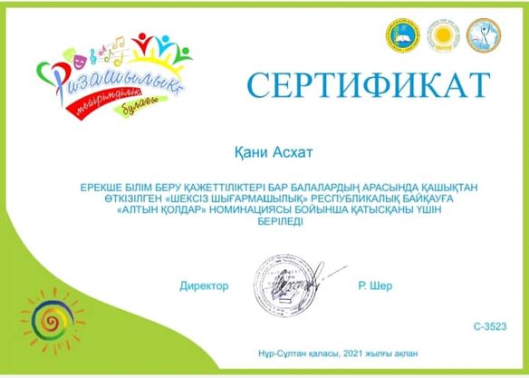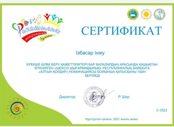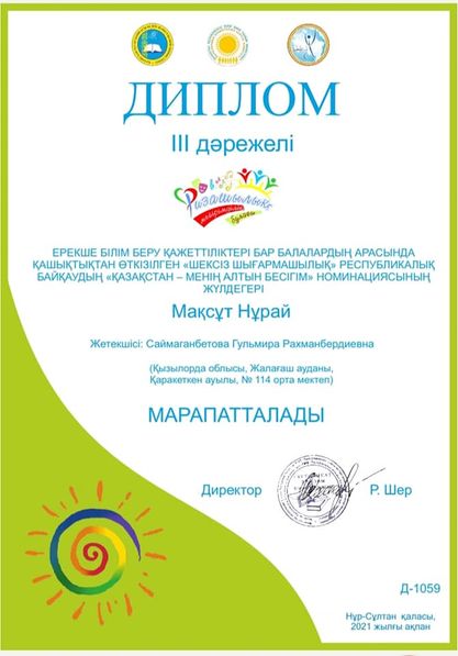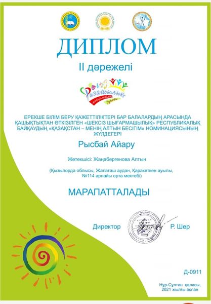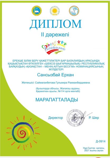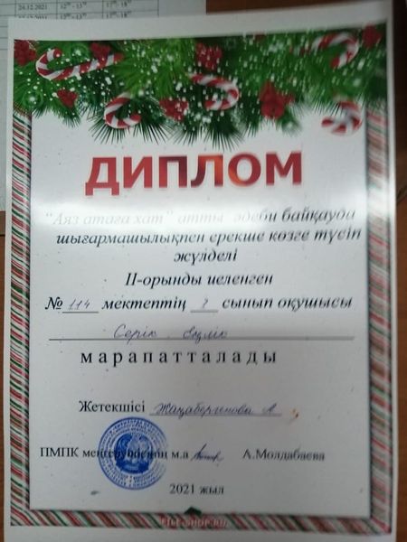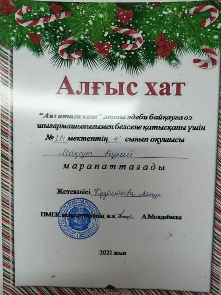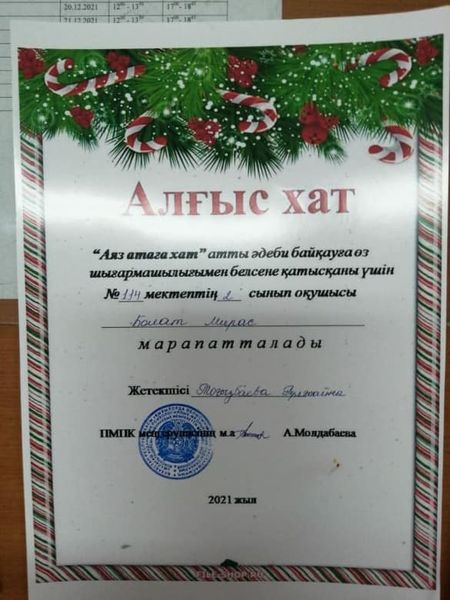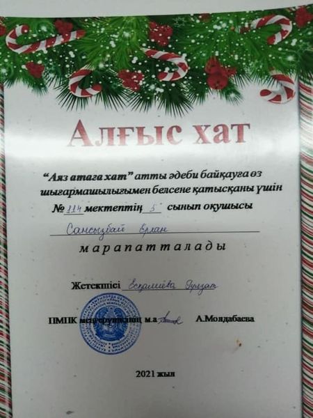 Аудандық ерекше білім беруді қажет ететін орталықтың ұйымдастыруымен "Аяз атаға хат" атты әдеби байқауға өз шығармашылығы мен белсене қатысып,ерекше көзге түскен 1-сынып оқушысы Серік Еңлік 2- орынмен, жетекшісі: Жаңабергенова Алтын апай және Алғыс хатпен 2-сынып оқушысы Болат Мирас,жетекшісі Тогысбаева Гүлжайна апай, 4-сынып оқушысы Мақсұт Нұрай,жетекшісі Күзембеава Айнұр апай, 5-сынып оқушысы Сансызбай Асхат,жетекшісі Есқалиева Гүлзат апайлар марапатталды.