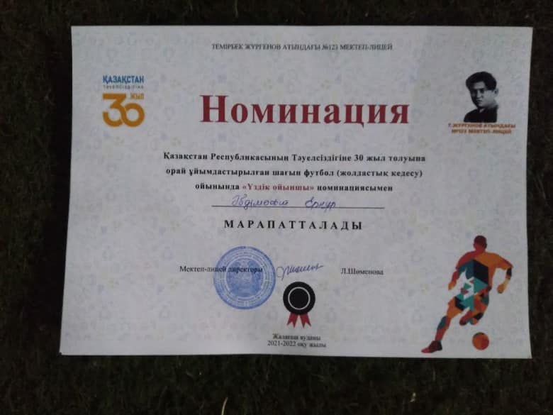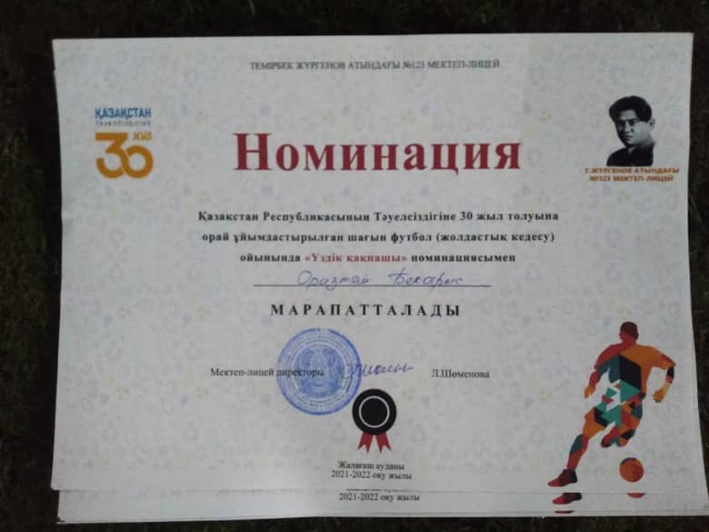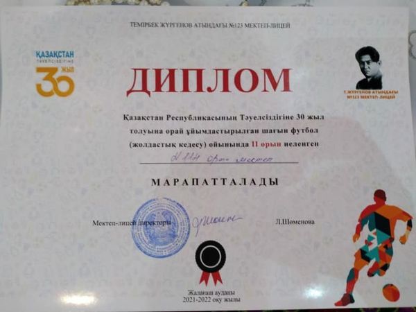 Қазақстан Республикасы Тәуелсіздігінің 30 жылдығы және "Мен зорлық-зомбылықсыз өмірді қалаймын" науқаны аясында футболдан жарыс өткен болатын. #123 және #114 мектептердің 4-5- сыныптар арасында шағын футболдан жолдастық кездесу болып өтті.